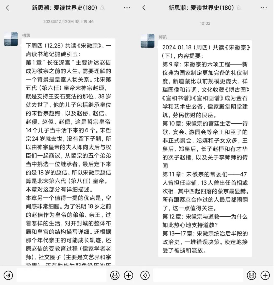 2022年6月,梅老师在青岛方所开设“爱读世界史”分享会,每月一期,以“年代:从1500年开始”这个题目开始第一期,十期后完结,期间穿插五期“全球史共读会”。2023年7月,在店员、读者的强烈要求下,又增设“爱读中国史共读会”,目前已举办六期:《叫魂》《雍正帝》《从丹药到枪炮》《胡若望的疑问》《纵乐的困惑》《宋徽宗》……作为一个历史类共读会,最多一期到场人数超过20人。