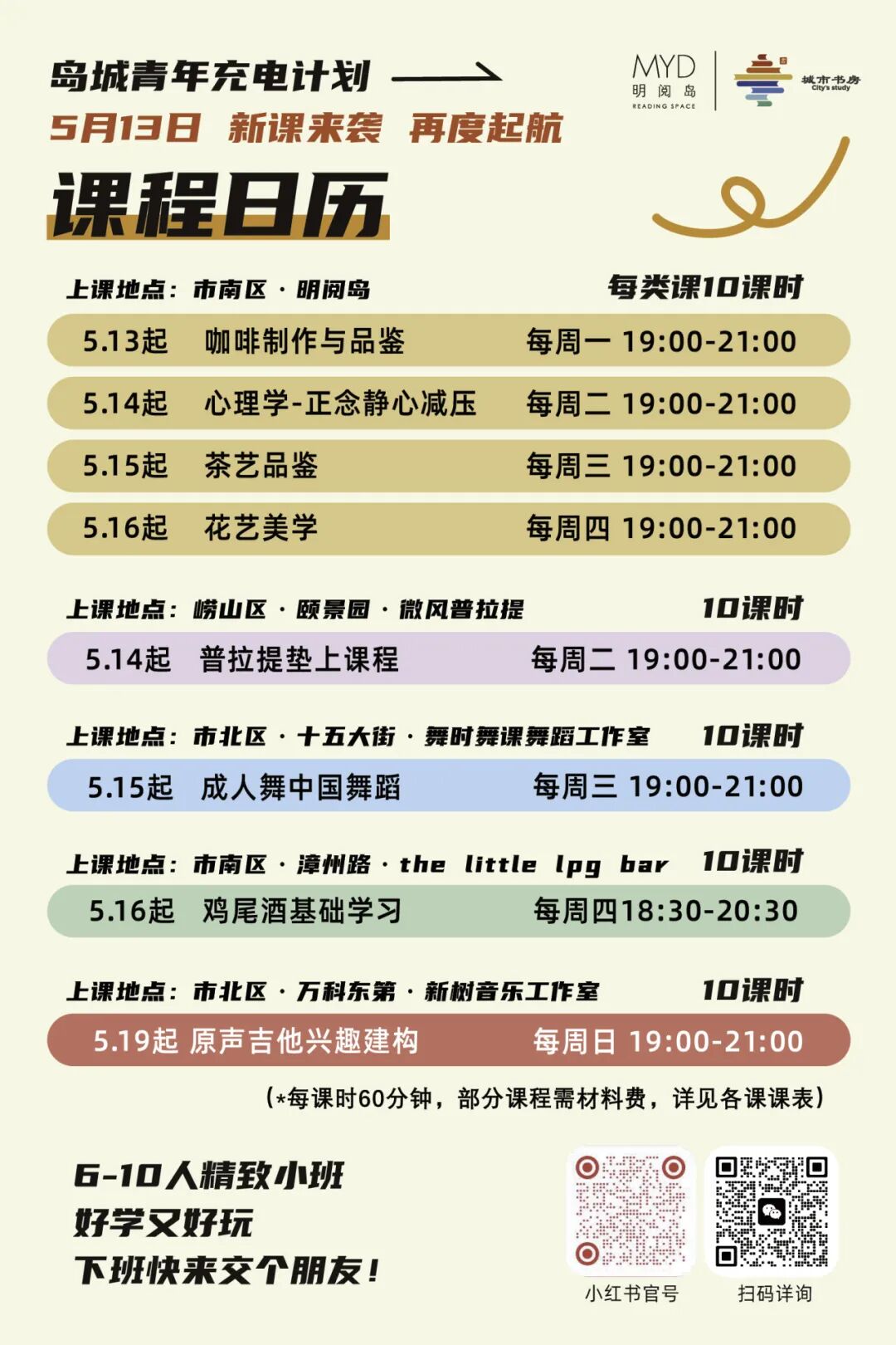 > 同时,为了给大家提供最优质的课程体验与服务陪伴,我们与岛城内多家优质垂类伙伴建立了深厚的合作关系,不断刷新增设夜校课程,为青年朋友们的兴趣和热爱找到最合适的出口。