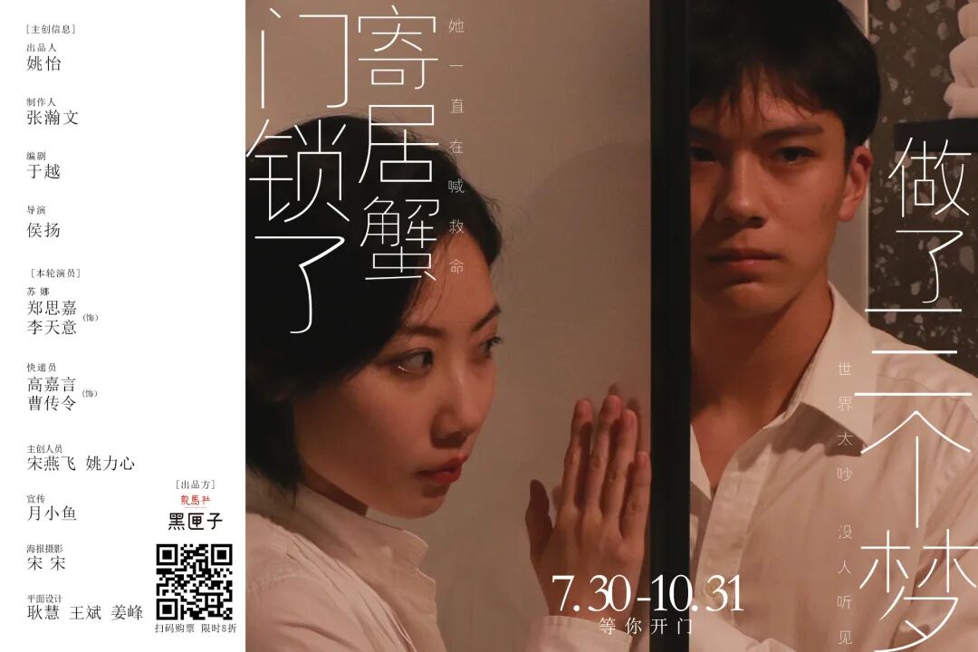 《门锁了,寄居蟹做了三个梦》在怡堡孵化出品,讲述了一个似梦非梦故事:一个大龄单身女白领被困浴室,一个快递员突然到访,密闭空间,女人和男人,故事就此展开……这个看似奇怪的剧名,究竟在讲什么呢?爱情?欺骗?浪漫?血腥?